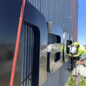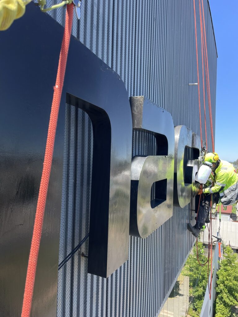 Servicio de reparación e instalación de letreros en altura, ejecutado mediante técnicas de acceso por cuerdas, permitiendo intervenir fachadas, estructuras y soportes publicitarios de forma segura, eficiente y sin interferir en la operación del lugar.